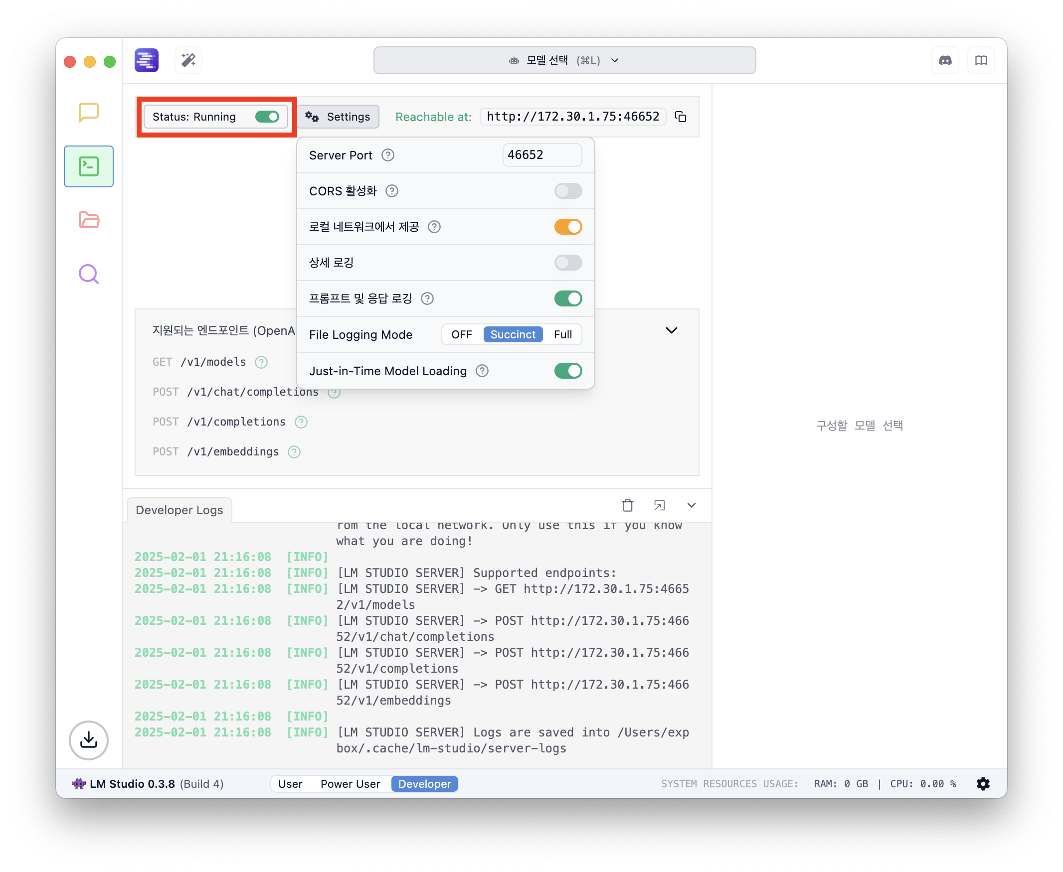 그리고 Status 부분의 스위치를 누르면 서버가 시작됩니다. 이러면 LM Studio의 설정이 끝납니다.