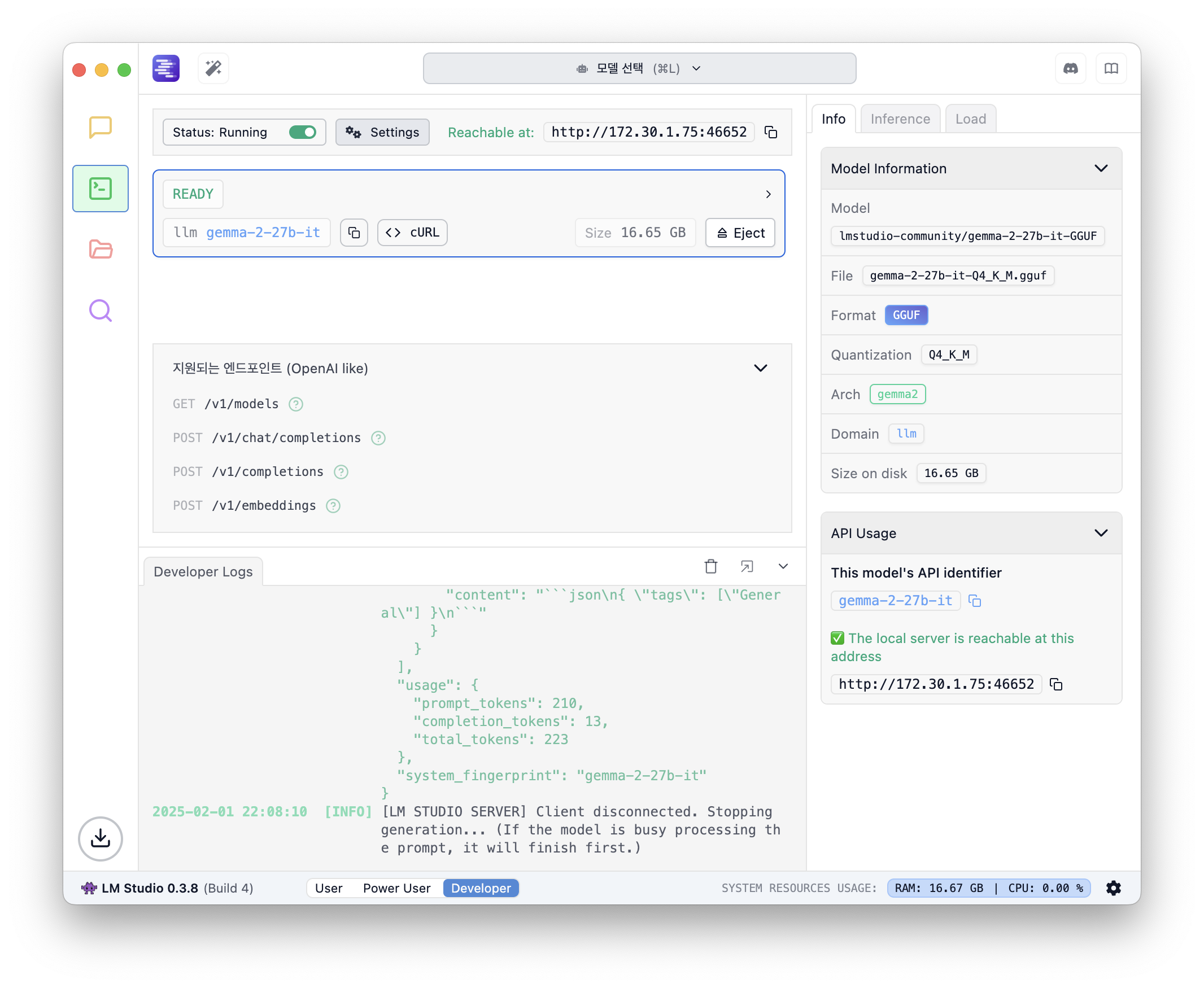 이렇게 LM Studio에서 모델이 로딩되고 사용할 수 있는 것을 확인할 수 있습니다.