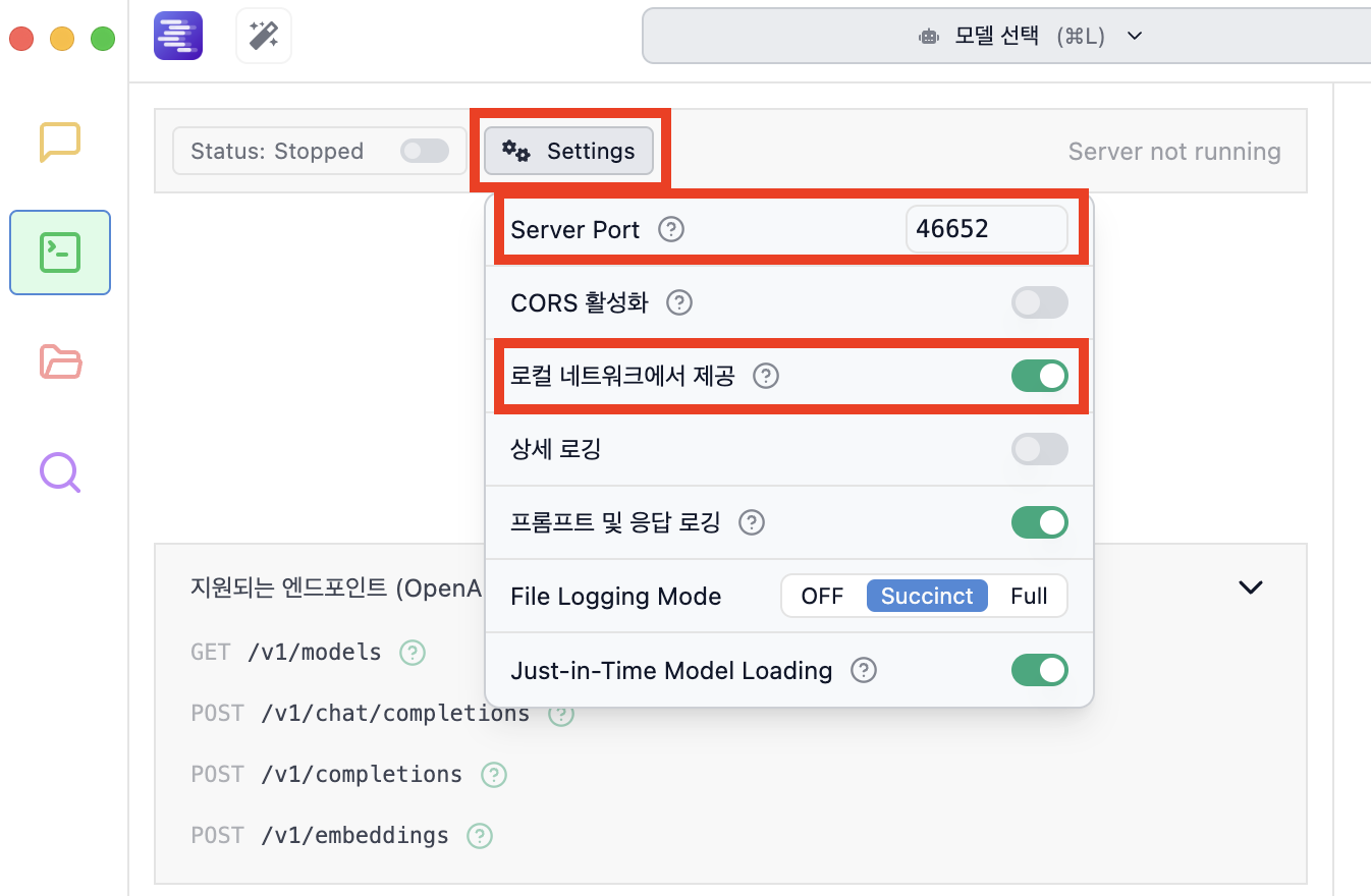 맥북을 서버로 사용하고 싶다면 '로컬 네트워크에서 제공' 설정을 켜면 됩니다. 요즘 M4 맥미니가 가성비로 나와서 그런지 서버로 사용하시려는 분들이 많더라고요. 그런 경우에는 이 옵션을 켜야 다른 컴퓨터에서 API를 사용할 수 있습니다.