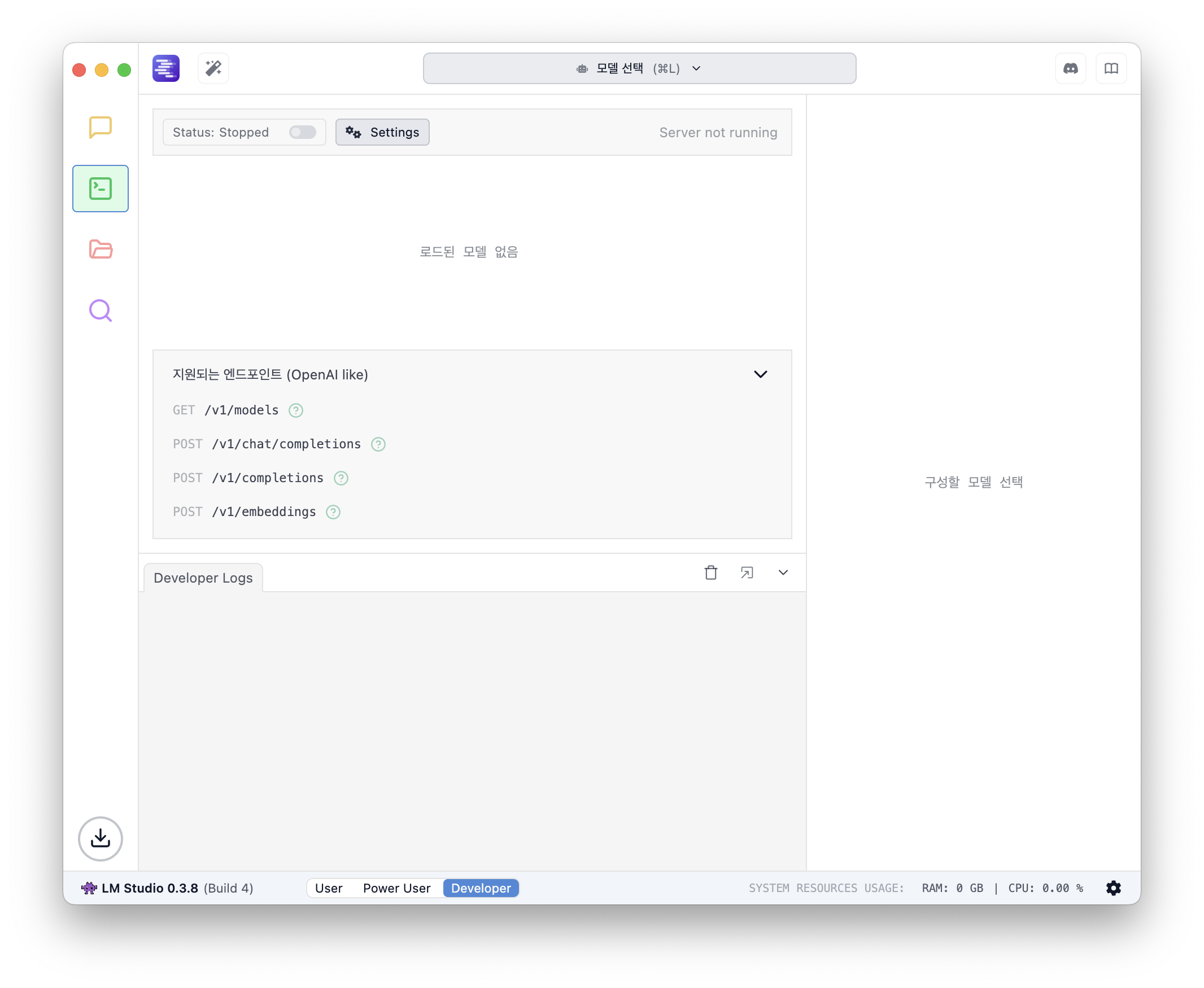 먼저 LM Studio의 세팅을 진행합니다. 먼저 왼쪽 아래에 있는 유저 타입을 변경합니다. 기본 설정이 Power User로 되어있어서 그대로 해도 되지만, 저는 Developer로 변경해 줄 겁니다. 변경하지 않아도 딱히 크게 문제는 없습니다. 다만, User로 설정만 안 해놓으면 됩니다.