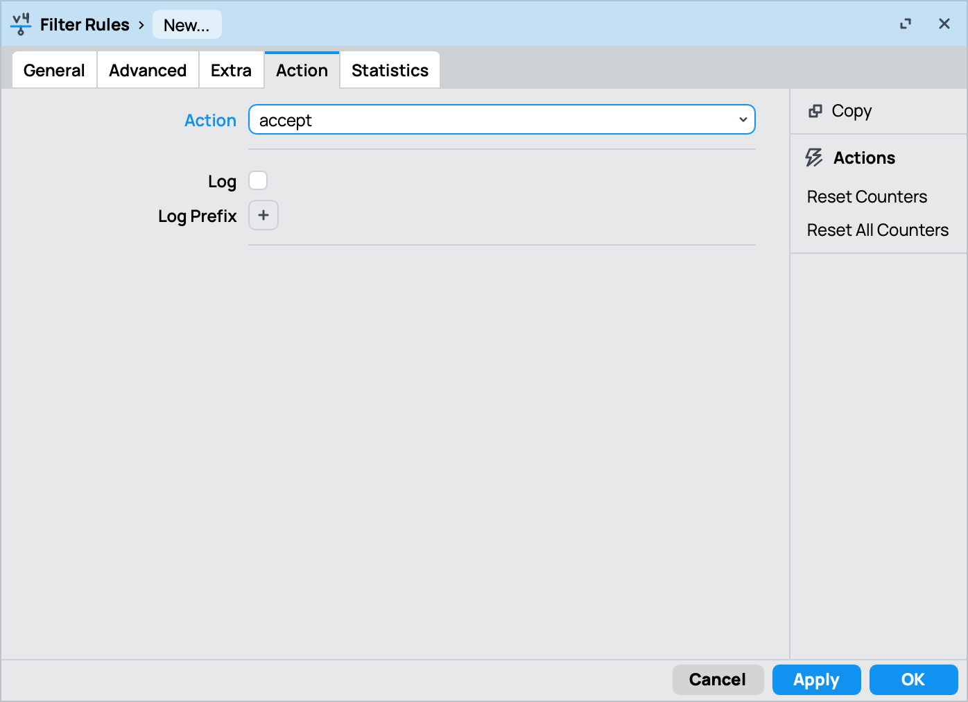 Winbox - IP - Firewall - Filter Rules 탭에서 New 버튼을 눌러 새로운 방화벽 규칙을 생성합니다.